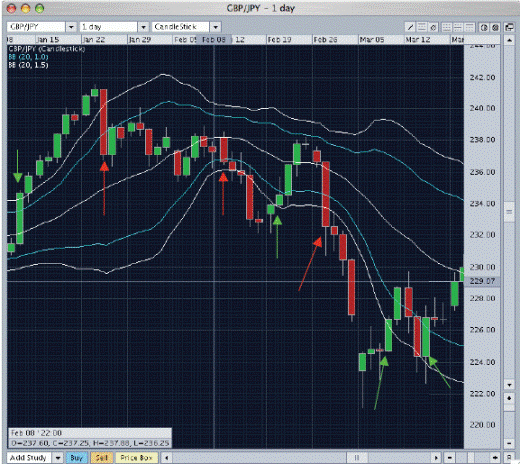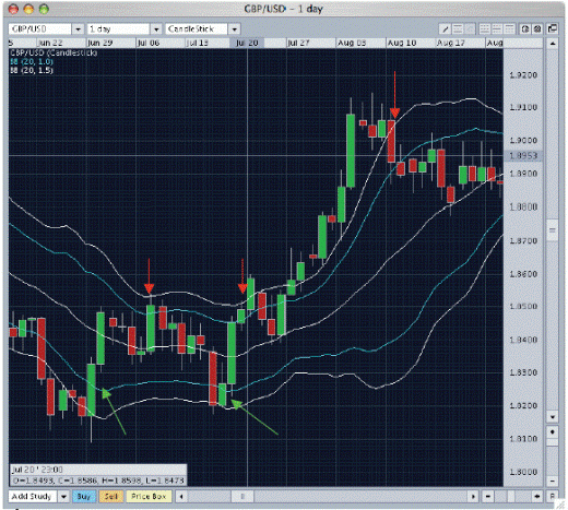 The 3 red arrows indicate to us when we make a bargain sale. As can be seen in all 3 cases the price touches the upper Bollinger white line, then still closed within the channel. As a profit again using the same SMA on the daily range.