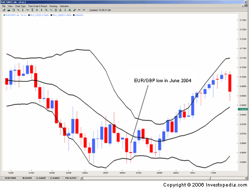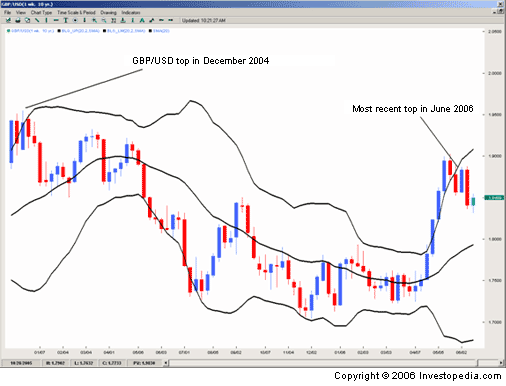 Installation inside day with Bollinger bands tend to also be applicable to the identification of significant turns on the weekly (W1), or even monthly (MN) charts for long-term trading positions. The following examples show the trading signals our setup at the top of the currency pair GBPUSD (weekly price chart) in Figure 4. At the bottom of a currency pair EURGBP (weekly price chart) in Figure 5.