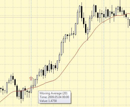 1. on the daily price chart to publish a 20-period moving average, SMA, and make sure that the price (closing) is above this simple moving average.
