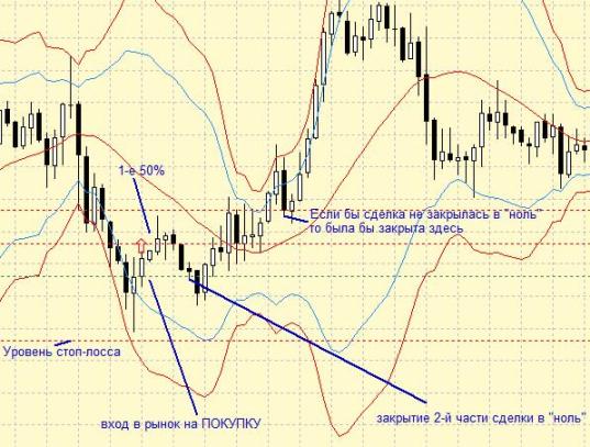 8. closing of the second part of the trading position is, once the price rose above the lower channel indicator Bollinger Bands 3SD-2SD, if this does not happen until close to the stop-loss order at a level exhibited break even.