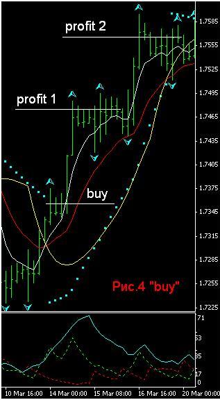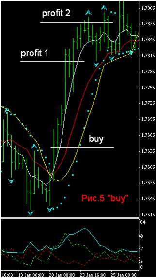 Entering the market at a signal to buy in this indicator forex trading strategy is carried out in exactly the same way as for sale, but all in turn.