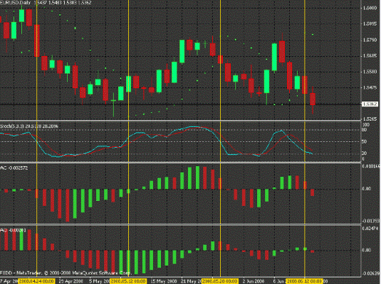 It should be noted that it does not matter in what order come the trading signals: ie, AO and AC indicators may change color at a later day candles after will be the first point of the indicator PSAR, or in front of file trading signal before the appearance of a given point on the chart.
