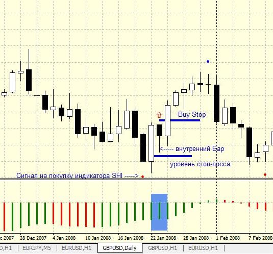 Wait until such time as fully formed inner bar and vystavte pending orders to buy or to sell (it all depends on the direction of the trend, which we define the indicator SHI) at 1 point value of the spread.