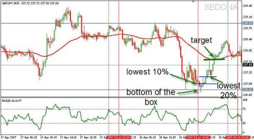 In particular, we are considering an example, the RSI was first in the overbought zone, then into oversold territory, and we can open a trading position to buy because the price is at the bottom of our-drawn rectangle. We can enter the market at any point, which is located in the bottom fifth (ie the bottom 20%) of our rectangle. In our example, the rectangle is restricted trading levels of 239.91 and 236.81 (210 points), we can enter the market at any price that is below 237.3.