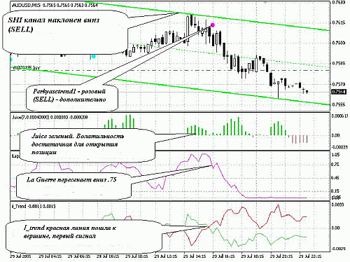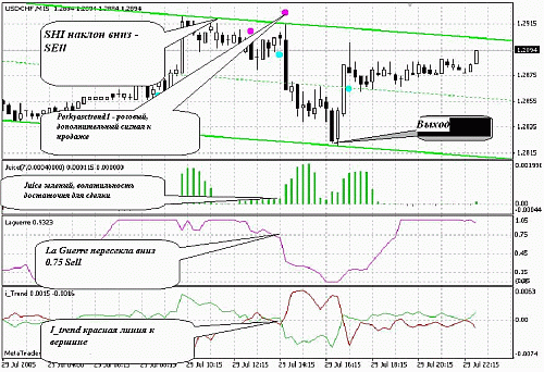 3) If the forex — Juice green should hold the position until the opposite side of the channel-drawn, and if it is red, you should close the open position when the midline Guerre (0.45).