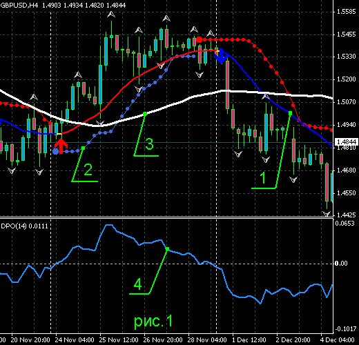Indicator DPO (14) — line indicator forex must cross below the zero level.