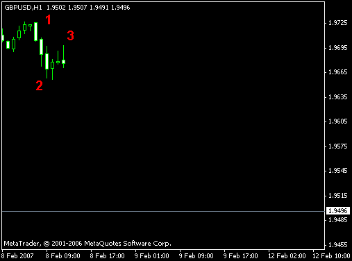The first thing we observe a local peak. For myself thinking: What if at this point is a trend reversal? — And put on the chart number 1 (just in case).