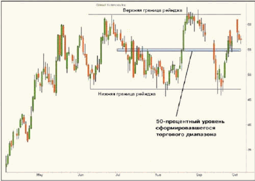 Fig. 1. Conclusion of a deal to buy at higher market formed above the middle price range and sell at lower below the same level gave traders a good opportunity for profit. Prices in the market several times very easily raised from the middle zone of 10-12%, and fell from it as possible, even a large amount. Profit was fixed at the boundaries of the trade price range.