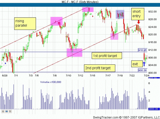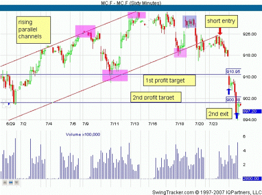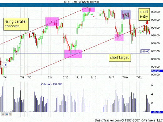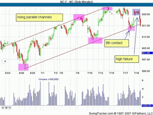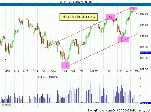 In the range from mid-June to early July 2007 futures S & P 400 MidCap E-mini move in the price chart in the uplink, as you can see at the bottom of the hour presented a chart. And although the MidCap and remained near its record high price, it is still trading in a large trading range. Parallel channel gives us a glimpse of part of the lateral motion.