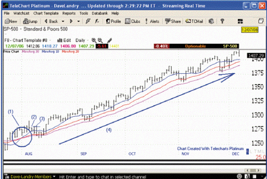 On the chart in Figure 4 we observe how the three moving averages of the index S & P 500 have formed our pattern of «bow tie» in August 2006, as order averages switched to the correct order of the rising price trend 10SMA> 20EMA> 30EMA. After that, the market suffered reversals, which resulted in the implementation of Condition 2. Entering the market was carried out as soon as the old was knocked maximum (3). After such a poor start the trend was so strong that the S & P moved in an upward trend during the remaining months of 2006 and early 2007.