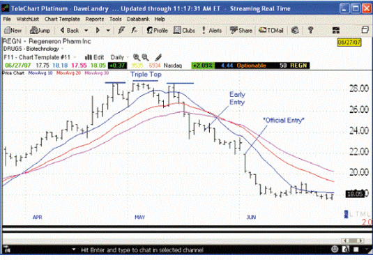 A good example of the above, gives the schedule of shares Regeneron Pharmaceuticals (REGN) — Figure 5. Pay attention to the fact that in May 2007, the market share was formed small triple top, and then began to discard. Instead expect the formation of a pattern bow tie, you can enter the market and earlier, the first reaction. Thus, you can enter the market very earlier than the pattern emerge and get a little more profit.